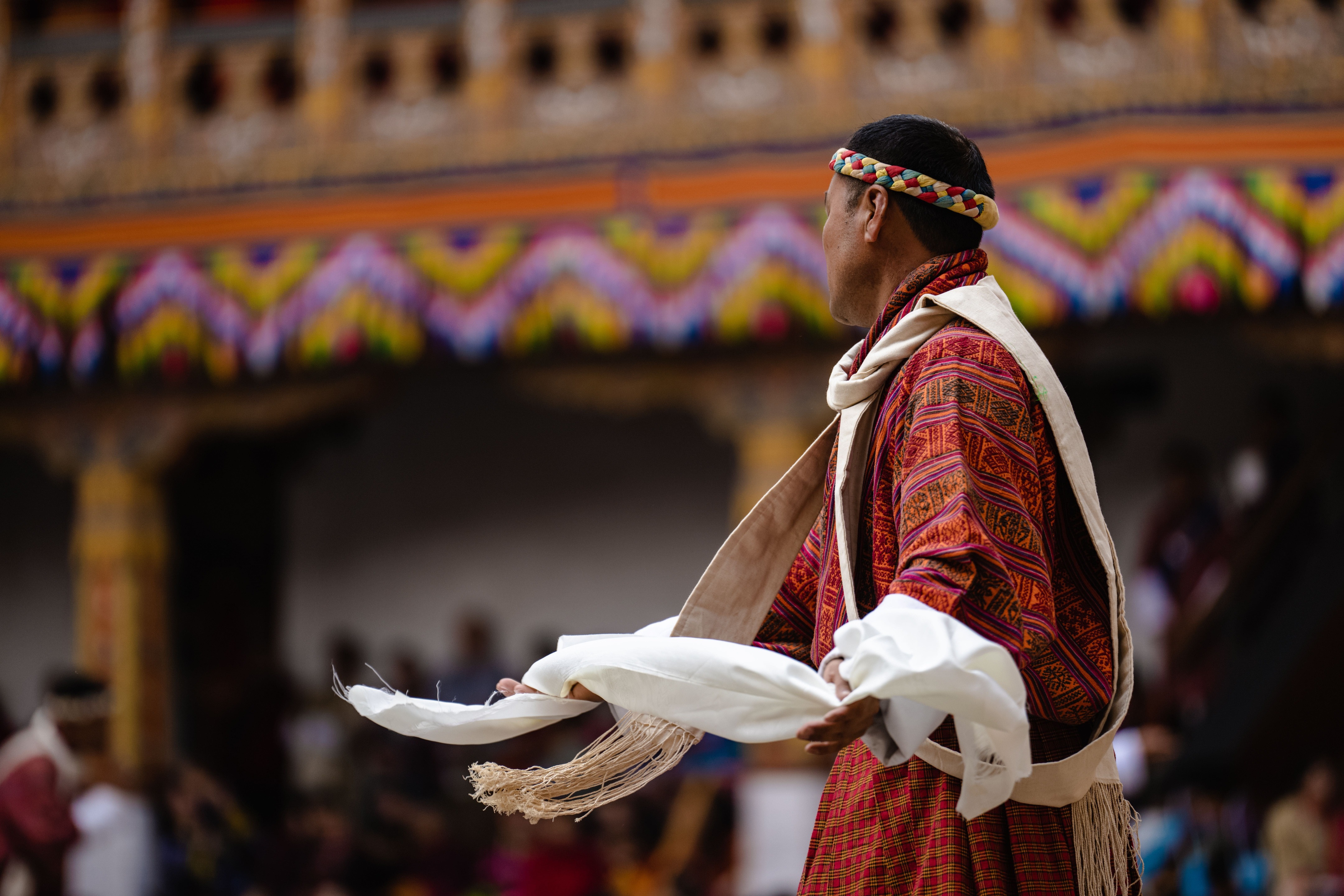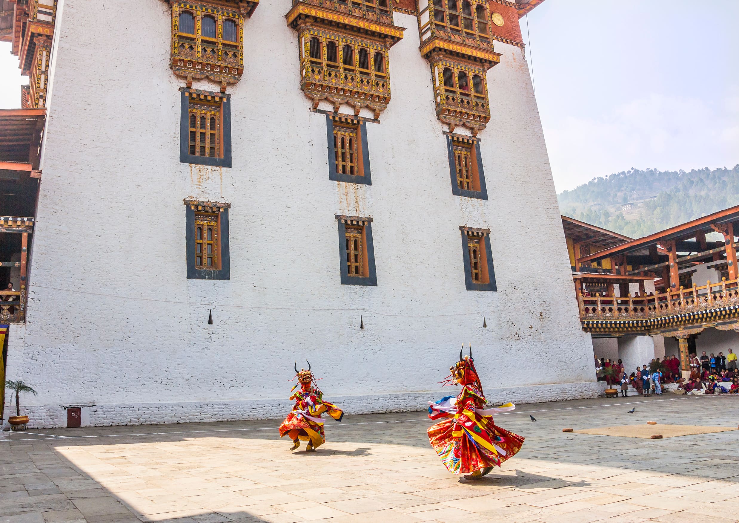 Le bouddhisme dit du Vajrayana, du “véhicule de diamant”, irrigue la vie du Bhoutan. Ici, le temps ne se mesure pas seulement aux saisons, mais à une succession de célébrations religieuses qui ponctuent toute l’année. Les tshechu, littéralement “le dixième jour”, en référence à la naissance de Padmasambhava, fondateur du bouddhisme tibétain, célèbrent sa vie et ses enseignements. Dans la cour des dzongs et monastères, les tshechu déploient une liturgie spectaculaire. La foi s’y exprime par la prière, par les cérémonies d’offrandes, mais surtout par la danse. Au Bhoutan, les moines dansent depuis des siècles pour célébrer la victoire du bouddhisme sur les forces négatives. Vêtus de robes chatoyantes – rouges, jaunes, bleues –, coiffés de masques grimaçants représentant le visage de divinités courroucées, ils tournoient, bondissent, articulant gestes théâtraux et cris impressionnants dans un théâtre de mime millénaire. Le cham, danse codifiée dès le VIIIᵉ siècle, piétine les mauvais esprits et les énergies néfastes, chasse la colère, la jalousie et l’ignorance, et propose dans ses chorégraphies la destruction du moi et la voie de l’illumination. On est emporté par cette ronde de ferveur et de joie, avec l’impression d’assister à une fête médiévale, une grand-messe épique, où la foule entière communie dans un même souffle.