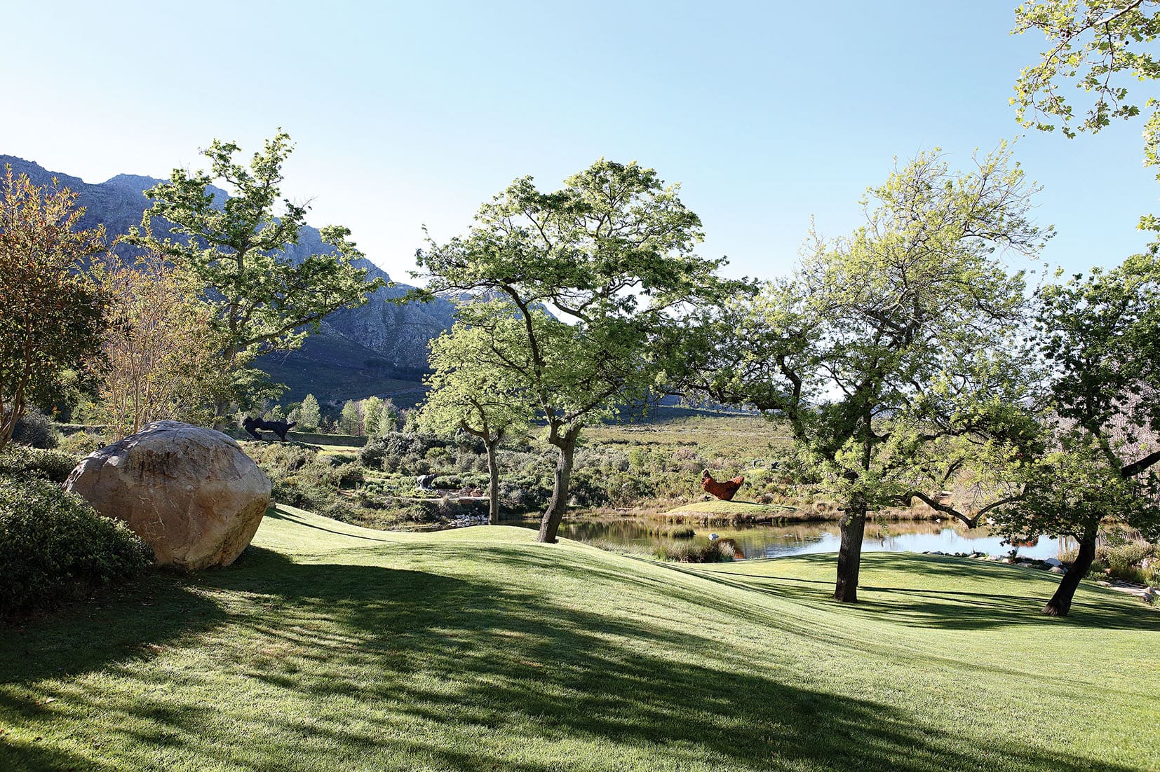 Le Dylan Lewis Sculpture Gardeen s’étend sur plusieurs hectares au pied des montagnes des Winelands. Le jardin mêle fynbos, aloès, restios, graminées et arbres méditerranéens, dessinant un paysage où les teintes évoluent naturellement, du vert profond des sous-bois au gris acier et à l’ocre des zones ouvertes. L’ensemble est structuré par des sentiers de pierre qui traversent des bosquets denses et des clairières, dévoilant des vues dégagées sur les collines environnantes. Les sculptures de Dylan Lewis, en bronze et en acier patiné, sont installées en dialogue direct avec le relief et la végétation. Leurs surfaces oxydées contrastent avec les masses végétales et se transforment selon la lumière, souvent franche et rasante. Inspirées de la faune, de figures mythologiques et de formes organiques, les œuvres s’intègrent sans artifices scénographiques, laissant au jardin un rôle central. La qualité paysagère du site structure l’expérience de visite et permet une lecture claire des œuvres dans un environnement naturel exceptionnel.