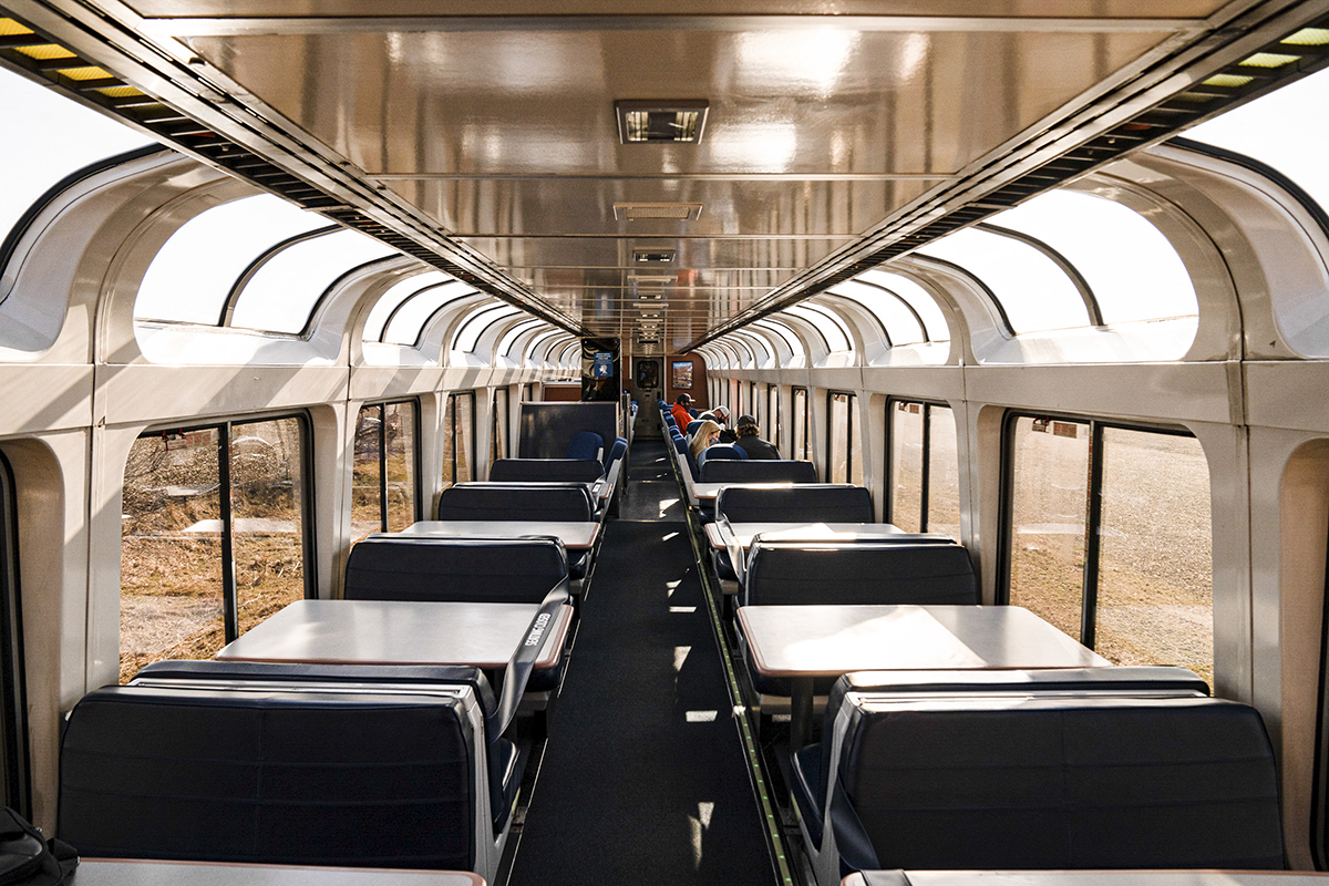 Les étendues agricoles de l’Illinois sont introduites en premier. Puis, des fleuves qui marquent les frontières naturelles : le Mississippi pour le passage dans l’Iowa, le Missouri pour le Nebraska. La course vers les Rocheuses figure parmi les moments-clés du voyage. Leur silhouette imprime encore l’esprit en s’engouffrant dans la pénombre du Moffat Tunnel. De l’autre côté, le fleuve Colorado guide le train à travers les canyons – Gore, Glenwood –, avant de s’effacer face aux courbes empourprées de l’Utah. Le dernier jour confirme la vocation du Zephyr comme train le plus panoramique du pays avec une visite de courtoisie au Grand Lac Salé et aux cimes de la Sierra Nevada. Pour profiter de ces décors, la voiture panoramique est tout indiquée. Au programme : sièges pivotants et fenêtres qui s’envolent jusqu’au plafond.