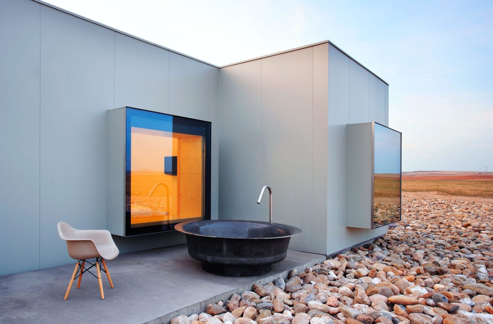 Un territoire aussi exceptionnel que les Bardenas exige un hôtel à sa mesure. En bordure du parc national, l’Aire Bardenas se tient à la hauteur de son environnement. L’établissement hôtelier est aussi inattendu que le désert lui-même. Les renommés architectes Emiliano López et Mónica Rivera ont conçu un refuge en parfaite harmonie avec la nature environnante, pour lequel ils ont reçu les prix les plus prestigieux. Vingt-et-un cubes brutalistes sont posés entre ciel et terre, entièrement ouverts sur l’extérieur, avec leurs baies sur l’immensité qui aimante le regard, étendue lunaire de roches et de pierres. Dix bulles translucides viennent compléter cette offre de symbiose avec le paysage – hautement instagrammable. À l’intérieur, lignes sobres et style minimaliste, presque austère, et matières chaleureuses – un luxe simple. Chaque chambre dispose d’un patio privé, avec arbres fruitiers et grande baignoire extérieure. Côté table, une belle assiette composée avec les fruits, légumes et herbes aromatiques du potager et de la région. Et le verre de vin qui l’accompagne invite à poursuivre le voyage un peu plus loin, dans la province de Rioja.