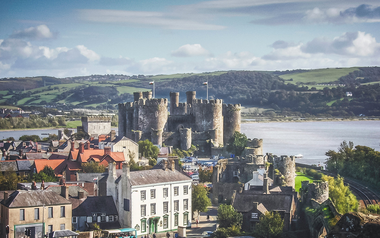 Nichée à l’embouchure de la rivière du même nom, la cité médiévale de Conwy conserve l’allure d’une place forte : ses remparts du XIIIe siècle, construits par Édouard Ier après la conquête anglaise, cernent toujours la ville. Hauts de quinze mètres, ils se parcourent encore aujourd’hui et enserrent un tissu urbain dense : toits d’ardoise, pignons étroits, venelles sombres. Au centre, le château domine, massif. Les tours circulaires, les murs épais, les cours balayées par le vent disent la logique d’un édifice militaire conçu pour durer. Les escaliers abrupts mènent vers des chemins de ronde, d’où la perspective s’élargit : le regard bascule vers la baie avec, d’un côté, les sommets majestueux de Snowdonia, et de l’autre, l’estuaire qui s’ouvre vers la mer d’Irlande.