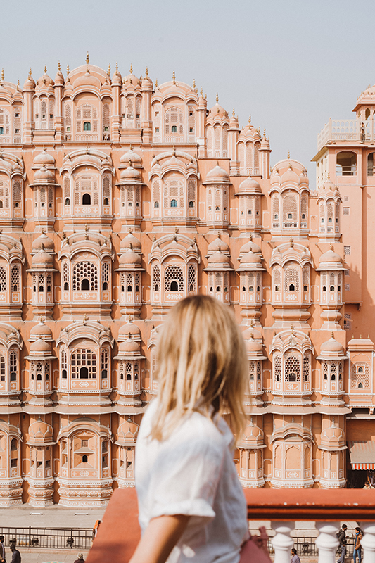 Dans les rues grouillantes de vie, les vieilles Ambassador blanches slaloment entre les vélos, les vaches et les rickshaws. Partout, les édifices exhibent leurs teintes ocre – “rose caramel” pour Rudyard Kipling, “fraise écrasée” selon Mark Twain. Au cœur de la ville, le Palais des vents s’élève comme une dentelle de pierre. Sa façade dessine une couronne de Krishna. Ciselée de 953 fenêtres étroites, elle dissimulait autrefois la vie secrète du harem de la cour rajput : les femmes de la famille royale, soustraites aux regards des hommes, s’y réunissaient pour observer la vie, les rues, le marché.