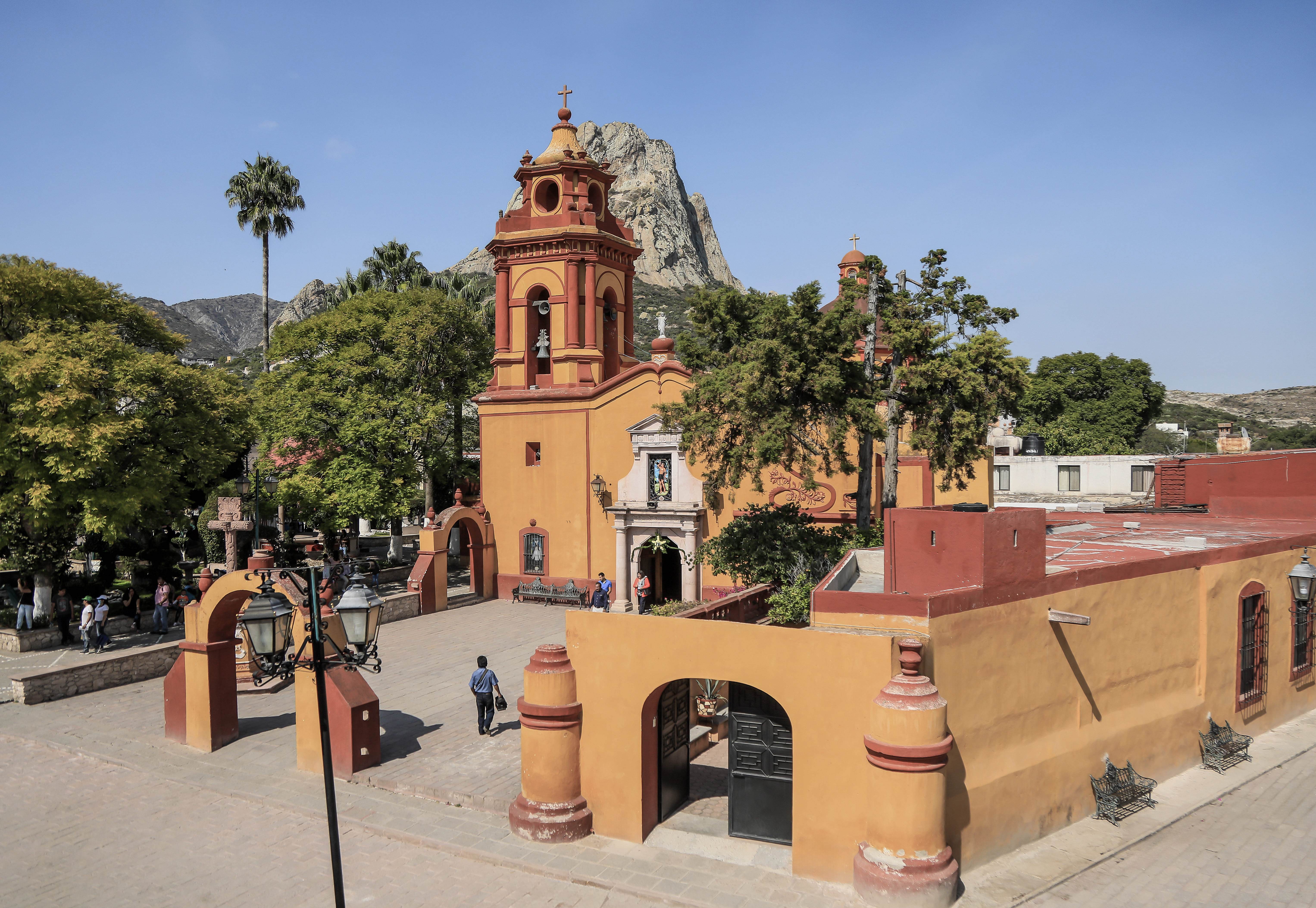 À l’approche de la sierra, belles éminences roux-bronze. Cactus toujours et Joshua trees. On traverse d’étonnantes étendues ravinées, d’un relief modeste mais très intriqué, aux bords émoussés. Le modelé de la montagne se fait ample, avec de lourds sommets à facettes, des drapés à plis embrassés. Partout, un arbrisseau en gerbe porte des fleurs jaunes. À une altitude suffisante, les arbres réapparaissent : feuillus et résineux, serrés. En ces lendemains de saison des pluies, les verts se nuancent indéfiniment dans la lumière dorée du jour déclinant. Les milieux changent à vue d’œil. On parvient à Jalpan, de Serra en hommage à fray Junipero Serra, forjador de la grandeza espiritual, cultural y material de la Sierra Gorda dit le piédestal de la statue que le pueblo y gobierno quaretanos lui ont édifiée en 1984. On ne pouvait espérer meilleur patronage. Le dispositif urbain est nettement dessiné : le zocalo, avec son kiosque, les bâtiments municipaux, la grande église Santiago de Jalpan dans son enclos, accessible par quelques marches depuis la place, le sacré exigeant des transitions. De part et d’autre, des rues à angle droit, dont la pente brouille l’orthogone idéal. C’est paisible sans être morne. C’est détendu sans être débridé. Autour d’un gobelet de café, on vous raconte, étranger pour étranger, les années passées à Chicago ou Seattle. Jalpan n’est pas un cul-de-sac ; la plaque tournante du coin plutôt.
