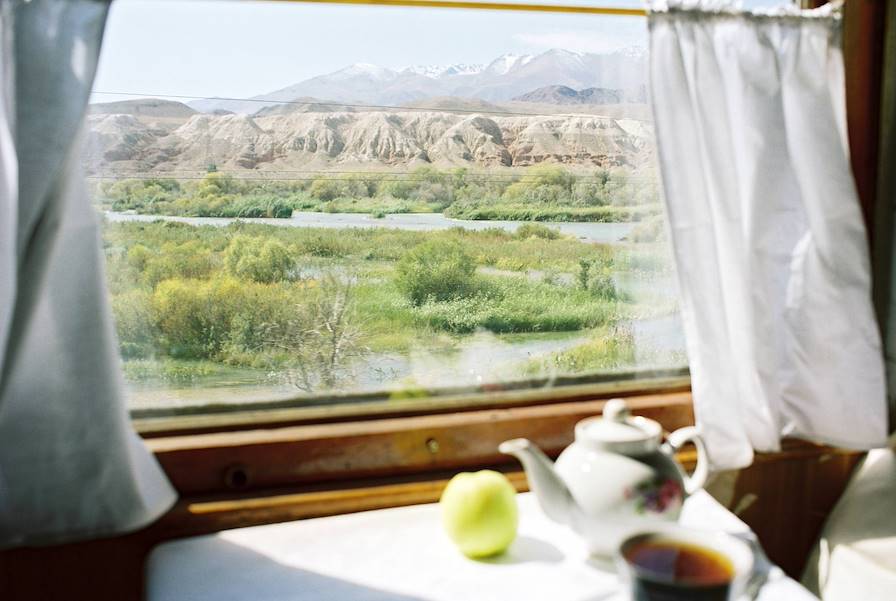 En fin de journée, transfert privé pour la gare et installation pour la nuit dans le train en direction de Tachkent, capitale de l'Ouzbékistan voisin. Dans votre compartiment double avec couchette, le confort est optimal. Il y a des toilettes un peu plus loin dans le wagon ; un espace restauration dans la voiture d'à côté. Et on se laisse facilement bercer par les roulements du train.