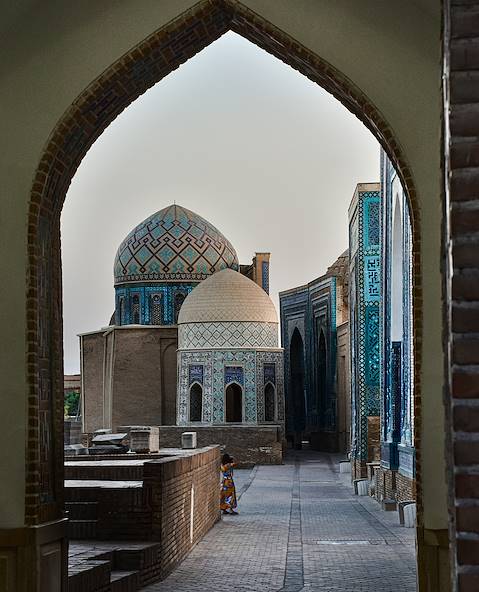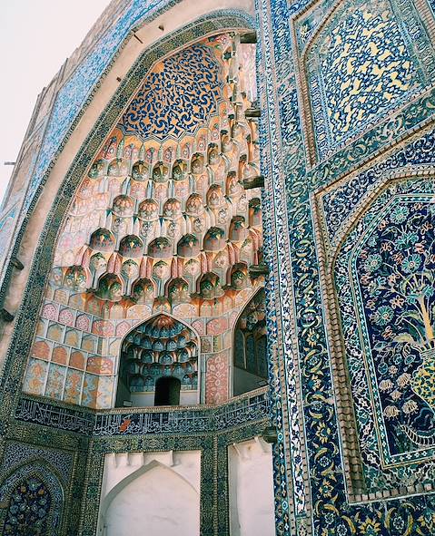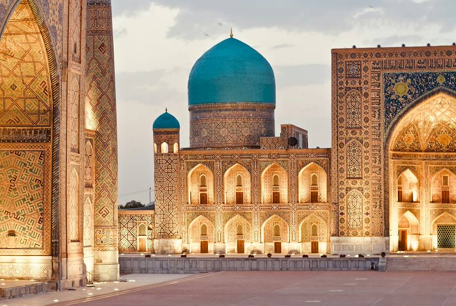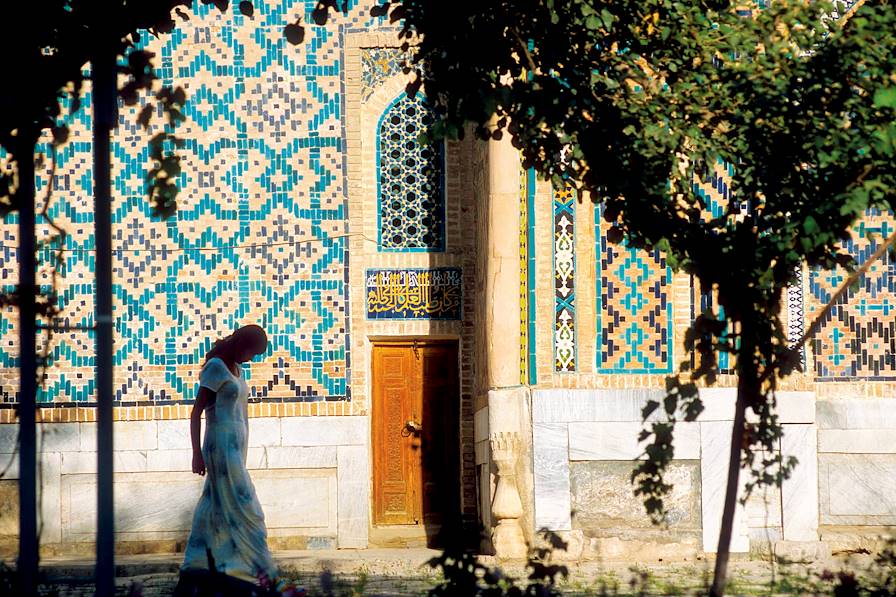 Déjà prévue - Visite privée de Samarcande, la cité bleue. Avec un guide francophone, on commence au Régistan, la place où étaient rendus publics les actes du pouvoir. Là sont trois médersas fameuses : Oulough Beg (XVe siècle), Cher Dor (XVIIe siècle) et Tilla Qari (XVIIe siècle). Ensuite, c’est le Gour Emir, le tombeau de l’émir, construit par Tamerlan pour l’un de ses petits-fils. Le conquérant y est enterré lui aussi ; la psalmodie de la prière des morts sur le cénotaphe de jade vert remue. Cet édifice majestueux ayant inspiré la grande architecture moghole, le Taj Mahal n’est pas sans dette envers lui. C’est encore à Timur Lang que l’on doit la mosquée Bibi Khanym (XVe siècle), une réalisation novatrice incluant des éléments de marbre. La légende veut que le port du voile par les femmes de Samarcande soit lié à un baiser que l’architecte de l’ouvrage aurait extorqué à la première épouse du commanditaire. Au pied de la mosquée se trouve le grand bazar, où sont en variété pains, fruits secs, légumes, épices, fromages, etc.