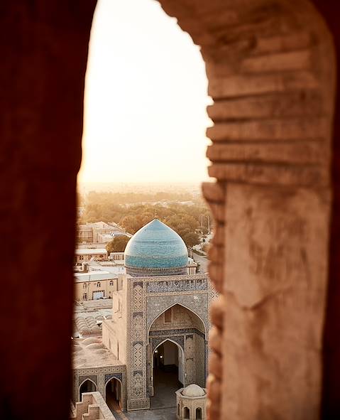 Déjà prévue - Visite privée du vieux Boukhara. Avec un guide francophone, revue de quelques-uns des plus beaux monuments historiques. L’Ark, la citadelle, est l’un d’eux. Édifiée au XVIe siècle par les mongols chaybanides, elle enferme à l’intérieur de ses remparts bombés une mosquée, une salle d’audience, des casernes, une trésorerie : tout le dispositif du pouvoir. En face, la forêt de colonnes à chapiteau polychrome de la mosquée Bolo Haouz et l’un des bassins qui ont fait l’agrément de la ville. Le mausolée des Samanides (IXe et Xe siècles) a été exhumé en 1934 et méticuleusement restauré. Au Po i Kalon se trouve la madrassa Mir i Arab, construite au XVIe siècle par le cheik soufi Abdoullah Yamani ; face à elle, la splendide mosquée (XVIe siècle) et le minaret Kalon (XIIe siècle) qui servit de roche Tarpéienne et de point de repère aux caravaniers. Dans les tâq, coupoles marchandes couvrant encore trois carrefours, le business n’a pas cessé depuis le XVIe siècle et, au besoin, les transactions se réalisent en euros. Pause thé de rigueur dans une choyxona.