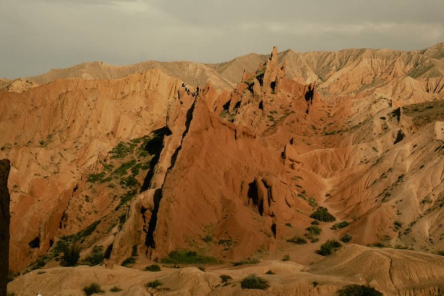 Au programme en chemin - Un premier arrêt au canyon de Skazka, dont le nom signifie "conte de fée". La terre ocre semble avoir été froissée par une main gigantesque. Il en résulte un enchevêtrement de vals et de vallons, de pics, de pinacles, d’aiguilles. C’est une merveille de se perdre là-dedans. Une seconde halte permet d'être initié à l'art de la construction de yourte. Le village qui vous reçoit est spécialisé dans l'édification de cet habitat traditionnel. Une famille locale se charge de vous instruire. L'occasion d'apprendre que le processus débute, curieusement, par l'installation de la porte.