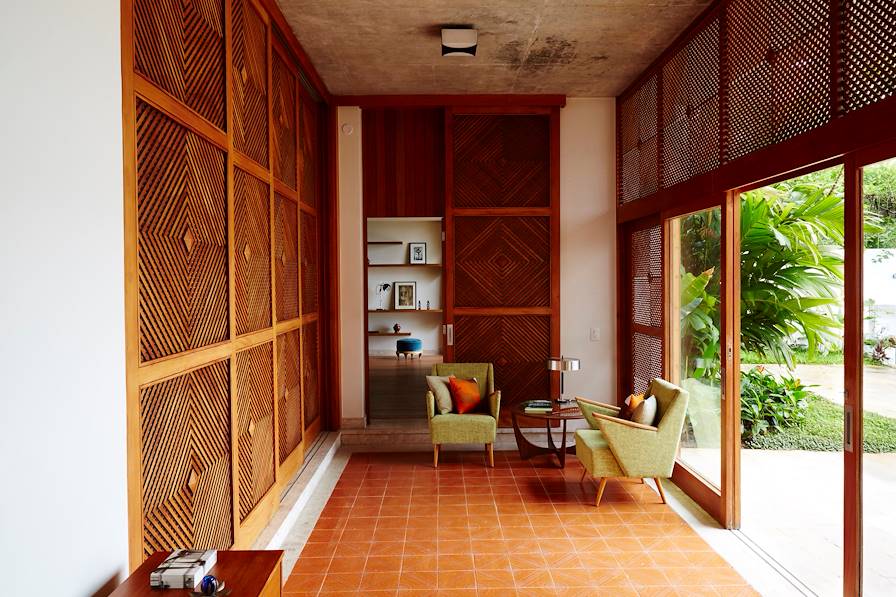 À l'arrivée, transfert privé et installation pour quatre nuits sur les pentes de Santa Teresa, au sein d'une maison d'architecte en béton brut et bois précieux. Depuis les hauteurs, la vue porte loin au-delà du jardin tropical, jusqu'à la mer. À l'intérieur, beaucoup de transparence, de lumière, d'éclat moderniste. Mobilier design et luminaires colorés. Partout – chambres, salles de bains et parties communes – un confort cool et élégant. La piscine extérieure, une rareté dans le quartier, s'apprécie à sa juste valeur aux heures les plus chaudes.