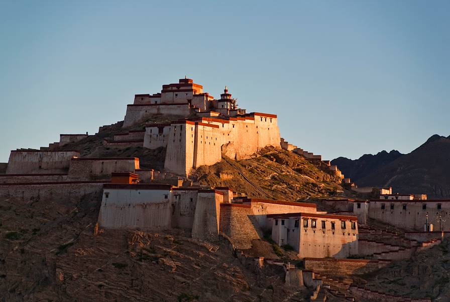 Transfert privé à Gyantse, 3977 m. On passe deux cols : Gampa-La, 4794 m, au-dessus des eaux bleues du lac Yamdrok-Tso, et Karo-La, 5020 m, d’où la vue est époustouflante sur le massif du Noijin Kangsang. Au passage, visite du monastère drukpa Ralung, fondé au XIIe siècle. Bonnets rouges. C’est le 18e abbé de Ralung, Ngawang Namgyal, qui, au XVIIe siècle, a jeté les bases de l’État du Bhoutan.