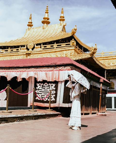 Transfert privé pour l’aéroport et vol pour Lhassa, 3650 mètres. À l'arrivée, vous êtes accueillis par un chauffeur et un guide privé. En chemin vers votre hôtel, visite du Jokhang, premier temple bouddhiste établi au Tibet (VIIe siècle), et éminent lieu de pèlerinage. Il abrite un Jowo Sakyamuni, statue en bronze doré du Bouddha adolescent. Laquelle fut apportée par l’une des épouses du roi Songtsen Gampo : soit la Chinoise Wencheng, soit la Népalaise Bhrikuti, cofondatrices du monastère au VIIe siècle.