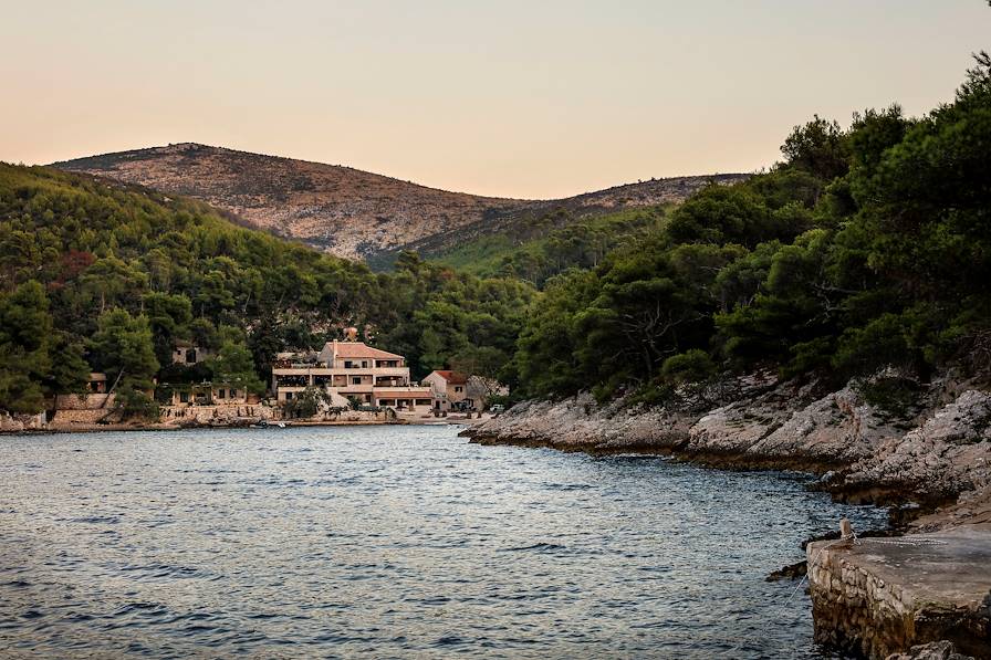 Accueil francophone à l'aéroport de Split par notre représentant local, assistance avec les bagages et transfert en véhicule privé jusqu'au port. Puis, traversée en hydroglisseur pour l'île de Hvar où un nouveau transfert privé vous mène du port jusqu'à l'hôtel. Installation pour trois nuits dans une ancienne ferme superbement restaurée, posée au bord d'une petite crique où les bleus et les verts se composent de façon changeante. Le bon esprit rustique chic a soufflé et le résultat, enveloppé de pins et de maquis, est très réussi. Pierre, bois, verre pour les bâtiments ; lin et coton pour la literie et le linge de table – tout est parfait. Les chambres, lumineuses, articulent impressions de vacances et émotions esthétiques (en plus d'être parfaites d'un point de vue pratique). Au nombre de quinze, elles ouvrent comme on l'espérait sur la baie. Le jardin aromatique descend vers la mer et ménage des petits coins intimes sous les oliviers. Des chaises longues attendent à fleur d'eau. On prend place sur les terrasses pour l'apéritif. Ceviche, tataki et poulpe se savourent sous les arbres. Dans la cave, bouteilles de France, d'Italie et de Croatie. Un petit spa propose des soins personnalisés professionnels et attentifs. Depuis les pontons, on bronze ou on plonge, c'est selon.