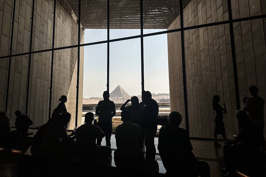 Également prévu avec le guide - Le Grand Musée Égyptien. Il est l'un des plus vastes musées du monde et le plus grand consacré à une seule civilisation. Le bâtiment, d'abord, impressionne par sa taille et par l'omniprésence des motifs pyramidaux qui font écho aux pyramides de Guizeh, toutes proches. À l'intérieur, on retrouve les équipements attendus d'un musée de cette envergure : centre de recherche et de conservation, auditorium, bibliothèque et, surtout, près de 22 000 m² consacrés à la présentation des collections permanentes, réparties par thèmes ("Terre d'Égypte", "Parenté et monarchie", "L'Homme, la société et le travail", "Religion et culture", "Scribe et savoir"). Le musée sert également d'écrin au tombeau de Toutânkhamon dont les éléments déménagés dès 2010 sont nettoyés, traités et étudiés par les conservateurs de ce nouveau musée.