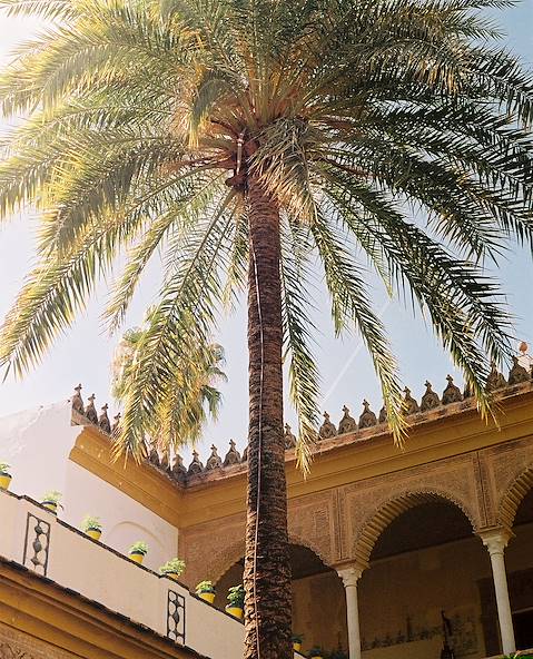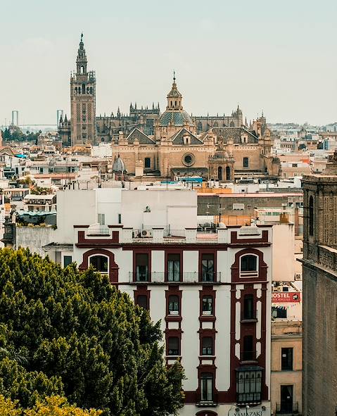 À l'arrivée, transfert privé et installation pour deux nuits dans le vieux Séville. Le quartier compte de nombreux restaurants et boutiques, ce qui rend les abords de l'hôtel très plaisants. À l'intérieur, un patio andalou agrémenté d'une jolie fontaine. C'est ici que le copieux buffet du petit déjeuner est généralement dressé. Une terrasse rooftop sur laquelle est aménagé un bassin où se délasser complète le tout. Quant aux chambres, elles séduisent par leur bon niveau d'équipement et de confort ; leurs contrastes de blanc, de bleu et de bois sombre marquent une fraîche élégance. La cathédrale de Séville et sa Giralda, comme le Palais de l'Alcazar (deux des trois symboles sévillans – avec la Plaza de España), se rejoignent facilement à pied. Cela tombe bien, vous avez déjà en main vos billets coupe-file pour l'Alcazar. Construit sur les fondations d'une forteresse arabe, ce monument est un extraordinaire condensé de l'histoire architecturale de la ville. Ses salles aux coupoles dorées, ses murs recouverts d'azulejos et ses magnifiques jardins ont été témoins de quelques-unes des pages les plus importantes de la ville et de l'Espagne. Quant à la Cathédrale de Séville, elle ne se trouve qu'à quelques dizaines de mètres. Érigée à l'emplacement même de la Grande Mosquée, elle est la plus grande cathédrale gothique d'Espagne et recèle la dépouille de Christophe Colomb.