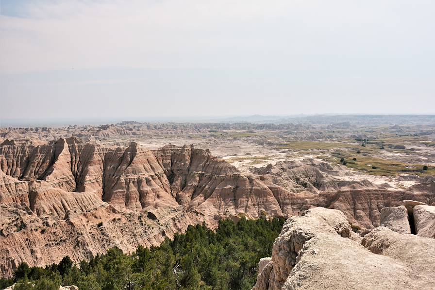 Route pour les Badlands, parc national de plus de 980 km² géré en partie par la tribu Sioux, et l'un des parcs les plus sauvages des États-Unis. De grandes plaines hérissées de roches sédimentaires aux couleurs étonnantes, des canyons et des pinacles affutés par l'érosion... Un refuge merveilleux pour les troupeaux de bisons, mouflons et chiens de prairie. Dans la partie nord du parc, on peut suivre la Badlands Loop Road – ou Highway 240 – qui serpente dans le décor féérique des paysages ruiniformes, croisant de nombreux points de vue, comme le Cedar Pass. Dans le sud, on jouit depuis le Pinnacles Overlook de vues privilégiées sur de formidables formations rocheuses.