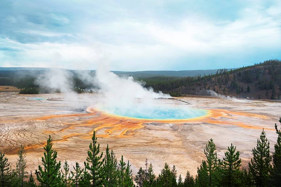 À ne pas manquer - L'Old Faithful Geyser, LA star du Yellowstone et l'un des plus hauts geysers d'eau chaude du monde, jaillissant toutes les 90 minutes environ parfois jusqu'à 40 mètres de haut – voire 50 mètres certains jours ; depuis l'Old Faithful, emprunter les sentiers de randonnée plus ou moins longs qui slaloment entre les sources chaudes et les geysers ; l'Upper Geyser Basin, au nord, site rassemblant la plus grande concentration de geysers d'eau chaude du parc, au jaillissement relativement imprévisible ; le Grand Prismatic, superbe lac multicolore et véritable merveille de la nature à admirer depuis le Midway Geyser Basin, très fréquenté, ou en grimpant le Fairy Falls Trail qui mène à une plateforme en surplomb de l'immense lac et permet de le voir en entier.