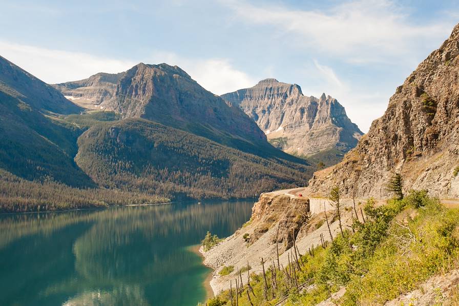 Facilement accessible depuis Whitefish, le Glacier National Park est le gardien d’un écosystème unique déclinant sommets enneigés et lacs par centaines, habitats de nombreuses espèces sauvages. La Going-to-the-Sun Road qui traverse le parc est l’une des plus belles routes panoramiques d’Amérique. Au petit matin, les reflets du lac McDonald offrent un spectacle apaisant avant que la route ne s’élève vers les sommets. En chemin, les Sacred Dancing Cascade, McDonald Falls et le célèbre virage The Loop ponctuent la montée de haltes spectaculaires. Plus haut, Heavens Peak puis le Logan Pass dévoilent toute la grandeur du parc. Depuis ce col mythique, le Hidden Lake Trail donne accès à un panorama inoubliable sur les lacs d’altitude et les prairies où paissent souvent marmottes et mouflons. En redescendant vers l’est, les paysages sont plus vastes et plus minéraux. Les points de vue de Siyeh Bend, Sunrift Gorge et surtout le Wild Goose Island Overlook, sur le St. Mary Lake, figurent parmi les plus impressionnants du parc. Lorsque le soleil décline, une lumière dorée enflamme les montagnes : le moment idéal pour reprendre la route vers l’ouest et conclure cette journée grandiose au fil des derniers reflets du soleil sur les sommets.