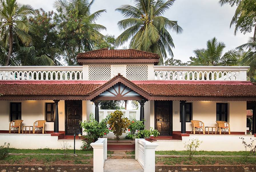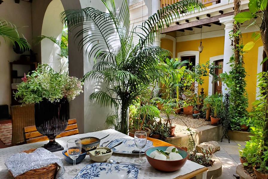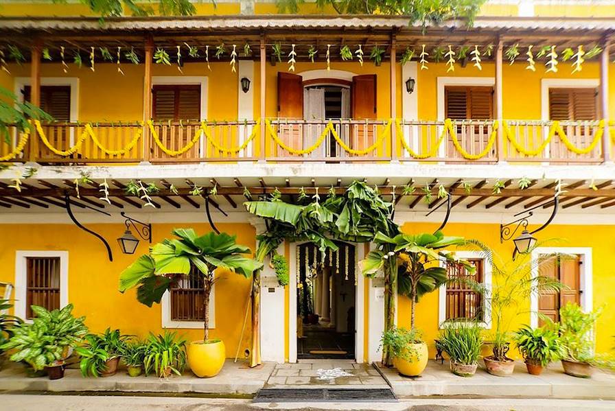 À l'arrivée à Pondichéry, installation pour trois nuits à White Town, l'ancien quartier français. À cinq minutes à pied de la mer, la belle bâtisse jaune vif ne dit rien de son âge : deux siècles environ. Les nouveaux propriétaires se sont employés à conserver le style architectural de la maison. Ainsi, ses hautes colonnes, ses larges arcs, la cour intérieure et le toit-terrasse en madras lui confèrent une stature qui sied véritablement à un édifice patrimonial. Une grande partie du mobilier est par ailleurs constituée d'antiquités restaurées. Le côté cosy du lieu – fauteuils en osier, jardin verdoyant et atmosphère conviviale – enveloppe instantanément.