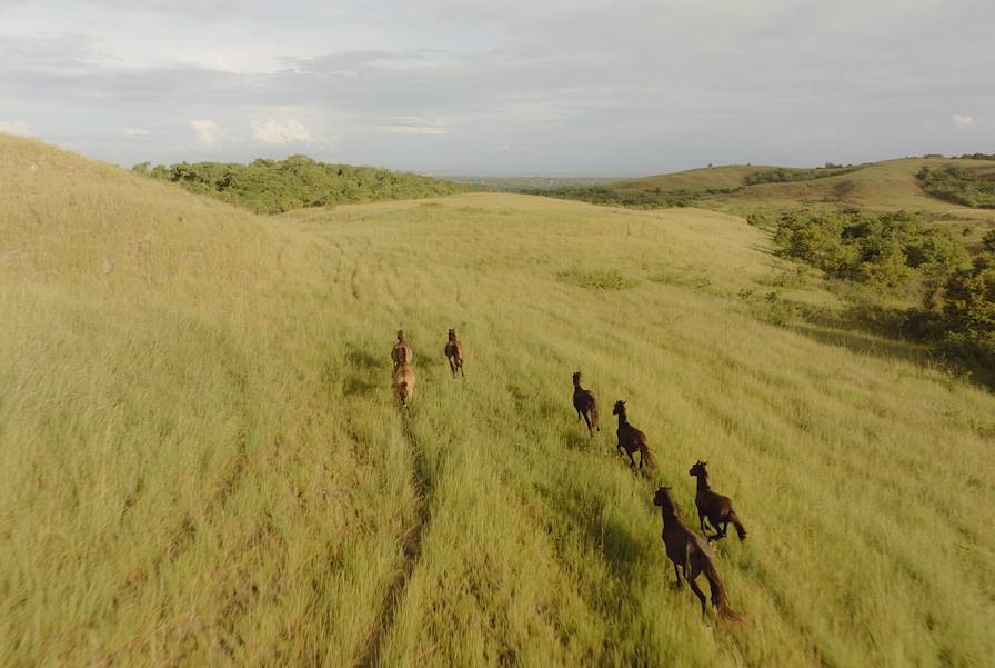 Au programme - Journée dans le centre de l'île, en privé. À nouvelle journée, nouvelle partie de l'île qui se dévoile toujours plus sauvage. Premier trésor naturel sur votre route : la cascade de Tanggedu dont l'eau claire se jette d'une falaise jusqu'à de paisibles piscines naturelles, idéales pour se rafraîchir après une petite marche. Vous explorez ensuite la vaste savane de Puru Kambera dont les herbes dorées ondulent sous le ciel lumineux, offrant des panoramas magnifiques. La journée se clôt par un émouvant coucher de soleil sur la campagne environnante que l'on admire depuis les collines de Tanau. De là, le feu du soleil semble embraser le ciel. Le soir, vous changez de port d'attache et vous installez pour une nuit dans les environs de Waingapu. Il ne faut pas s'attendre ici à trouver des équipements dernier cri et des services de chaînes internationales. Ce n'est d'ailleurs pas ce que l'on vient chercher dans cette partie de l'île. Les chambres sont équipées du strict minimum : un lit et la climatisation. Mais quelle vue ! Cette construction sur pilotis s'est en effet perchée dans les hauteurs et les grandes fenêtres des chambres – et de certaines salles de bains – s'ouvrent sur de splendides panoramas de collines verdoyantes. L'hôtel se trouve par ailleurs à proximité immédiate d'une rivière, ce qui permet d'explorer les environs en kayak. À toute heure de la journée, on prend un plaisir fou à se lover dans un pouf sur la jolie terrasse de bois et à laisser son regard se perdre à l'horizon. Un emplacement tout simplement sublime qui fait vite oublier le confort sommaire.