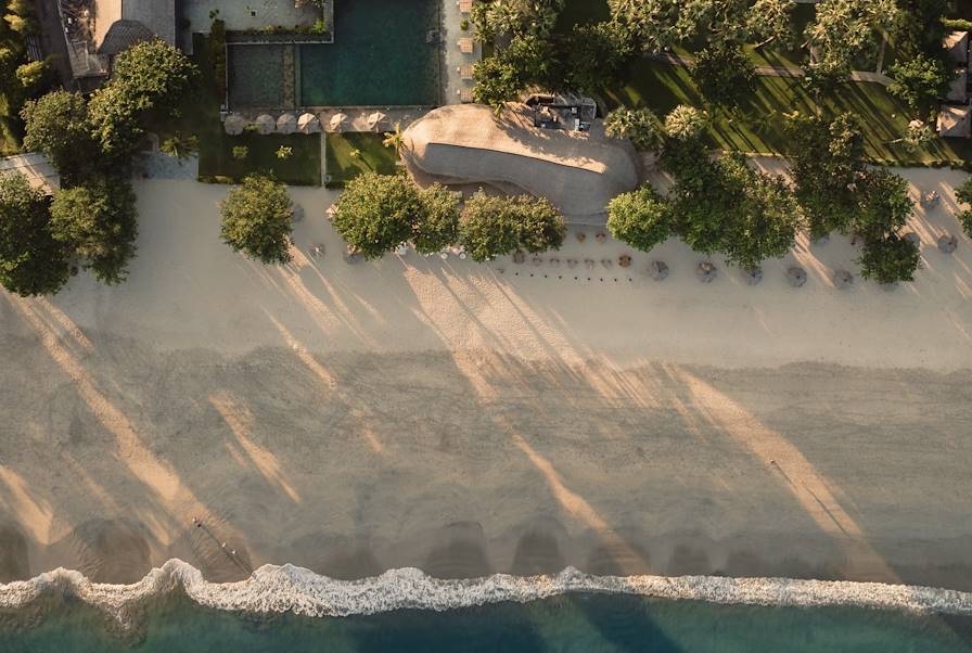 Transfert privé vers l'aéroport et vol pour Denpasar. Nouveau transfert jusqu'à Jimbaran et nuit au sein d'un hôtel au grand charme, entouré d'un jardin tropical planté d'hibiscus. Les cottages ont été bâtis dans le plus pur style balinais et s'ouvrent sur l'extérieur par des baies vitrées donnant sur le jardin ou l'océan. Les toits de chaume, les hauts plafonds et les poutres apparentes, le mobilier et les portes en bois de teck sculpté, les literies en soie et coton traditionnels, les baignoires asymétriques en marbre terrazzo concourent à l’élégance incroyable du lieu. Et puis la table y est fort romantique, on y mange les pieds dans le sable, à la lumière vacillante des torches plantées sur la plage en écoutant le va-et-vient des vagues…