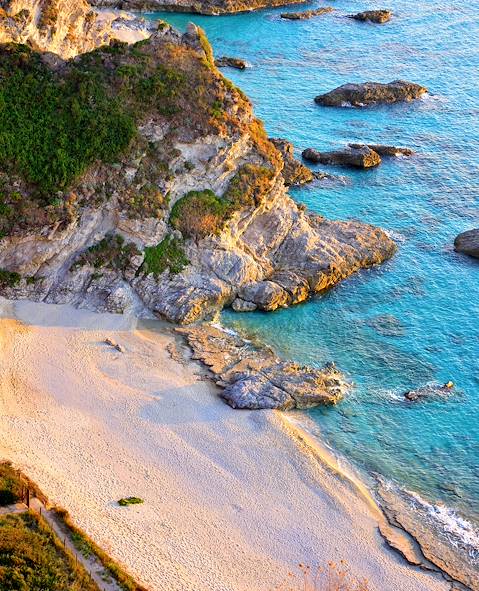 Route pour Tropea le long de la "Costa degli Dei" (Côte des Dieux), tronçon de terre qui s’étend de Pizzo Calabro à Nicotera. Selon la légende, les divinités elles-mêmes furent conquises par la splendeur de ce coin de pays : les rives de sable blond s’étirent paresseusement, les cavités creusées dans la falaise se dérobent au regard des curieux et de puissants éperons rocheux scellent le tout. Quant à la mer Tyrrhénienne, au fur et à mesure que l’asphalte prend son envol, elle offre un dégradé de bleu digne des plus belles aquarelles.