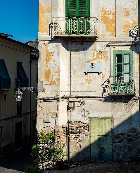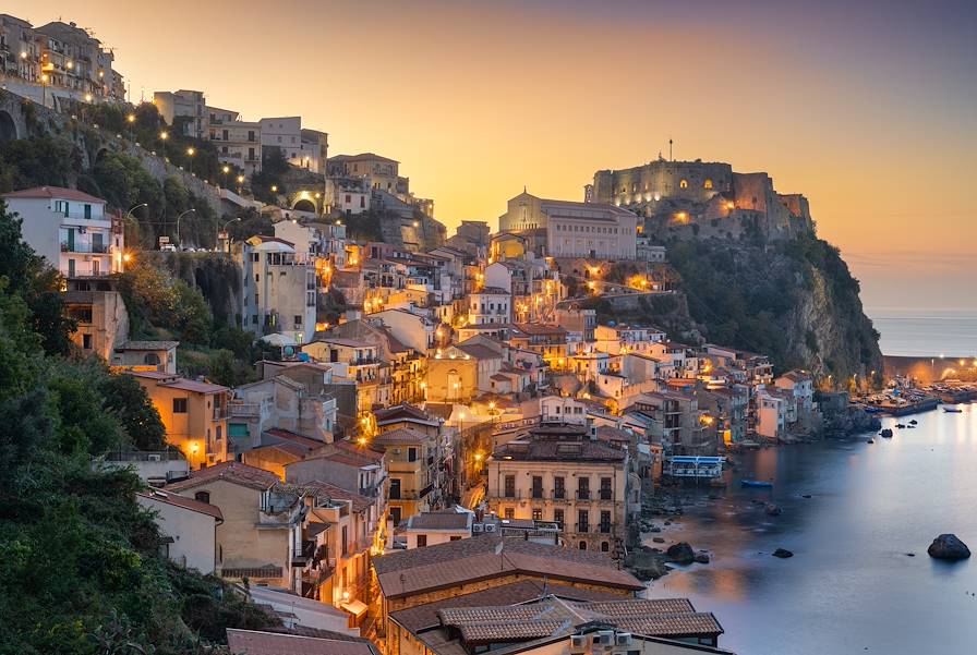 À voir en chemin - À 25 kilomètres au nord de Reggio de Calabre, face aux îles Éoliennes, la cité de Scilla apparaît indissociable de la falaise sur laquelle elle fut bâtie. Au loin, dans le détroit de Messine, la rencontre des mers Ionienne et Tyrrhénienne donne naissance à d’occasionnels tourbillons. Ainsi naquit la légende du monstre Scylla : six têtes, une triple rangée de dents, un faible pour les marins. C’est bien la quiétude, pourtant, qui prédomine aujourd’hui dans la bourgade. Sur la rive, la superbe plage de Marina Grande est fermée par l’éperon rocheux de Punta Paci. Perchée à son sommet, la silhouette du Castello Ruffo est immanquable. Elle surplombe le port où cabotent des bateaux chargés d’espadons.