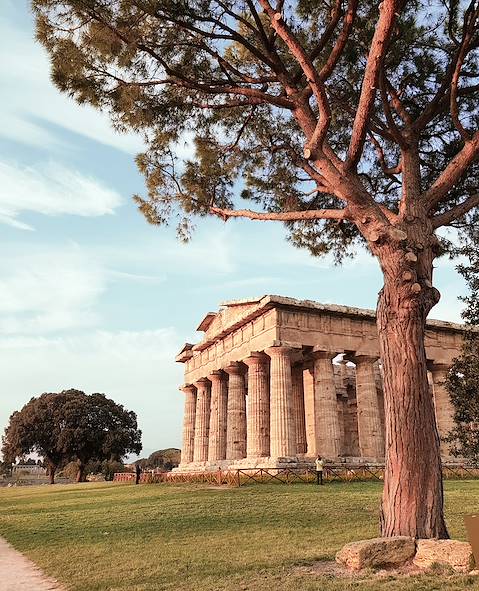 Au programme - Le site archéologique de Paestum. Paestum exhale le charme mélancolique des cités antiques. Les cyprès et les lauriers-roses le nimbent d'une atmosphère romantique. Ici, point de cataclysme comme à Pompéi, mais la malaria qui chassa les habitants à la fin de l’Antiquité, transformant peu à peu cette cité en paisible station balnéaire. Le site révèle ses trésors au fil d’une promenade : trois temples doriques magnifiquement conservés dédiés à Héra, Poséidon et Athéna, un forum romain, un amphithéâtre et les fresques de la Tombe du Plongeur, mondialement célèbres en archéologie car unique exemple préservé de peinture funéraire grecque figurative du Ve siècle av. J.-C. dans la Grande Grèce. En compagnie d'une guide privée francophone captivante, vous vous laissez conter l'histoire incroyable de ces lieux.