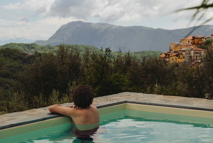 À l'arrivée, prise en charge de la voiture de location et route pour le village de San Pietro al Tanagro, situé au sud de Naples, dans l'arrière-pays. Installation pour deux nuits dans un petit agriturismo perché sur une colline à 600 mètres d'altitude. On y jouit d'une vue imprenable sur le Vallo di Diano, entouré d’oliviers et de forêts préservées. Les huit chambres spacieuses et modernes déclinent les tons crème et le mobilier en bois ; quelques pans de murs laissent apercevoir la pierre calcaire des monts Alburni. On apprécie particulièrement la longue piscine en surplomb des paysages verdoyants ainsi que le beau jardin méditerranéen. Et la table, qui fait la part belle aux produits issus des maraîchages, des élevages et des eaux alentour.