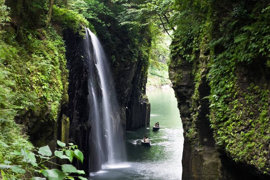 Takachiho dévoile une exceptionnelle beauté, véritable ode à la nature de Kyushu et haut lieu de la mythologie japonaise, en lien avec les origines mêmes de l'archipel. Les gorges de Takachiho s'étendent sur sept kilomètres, résultat des éruptions successives du mont Aso. Au fil du fleuve, les longs plis de la pierre sont à la fois spectaculaires et harmonieux. La végétation, qui s’accroche partout où elle peut, parfait l’atmosphère au romantisme indéniable. On canote volontiers dans les gorges où la rivière Gokase, aux eaux turquoise, serpente entre les parois rocheuses ; on longe les falaises grâce aux passerelles surplombant les gorges puis on va admirer la cascade Minai qui se jette dans la rivière. Sur place, on visite aussi le temple bouddhiste Shonen-ji, de l’école Jôdo shinshû, fondé au XVIe siècle au pied du mont Genbu, ainsi que le sanctuaire shinto Amanoiwato, consacré à Amaterasu, déesse solaire – le disque rouge sur le drapeau national, c’est elle.