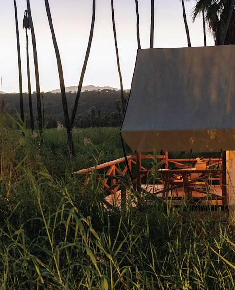 Route pour la côte plein Pacifique. Installation pour deux nuits au bord de la lagune de Todos Santos, entre le bourg et l’océan. De l’hôtel, un petit chemin conduit à la plage. Le jardin est luxuriant à souhait ; les palmiers seraient sonores, ils feraient monter la mélodie végétale dans les aigus. On a là-dedans de nombreuses cachettes, des sièges confortables, des fleurs et une grande piscine. Votre home est un dôme géodésique. Cette structure, qui n’est ni une chambre, ni une tente, est spécialement agréable à vivre, par son volume et sa rotondité. Elle vous procure l’équipement d’une suite de standing, avec une atmosphère différente. Et une sensation de bien-être que le spa se propose d’augmenter encore. Quant au restaurant, il tient un équilibre Mexique-Méditerranée et terre-mer des plus savoureux.