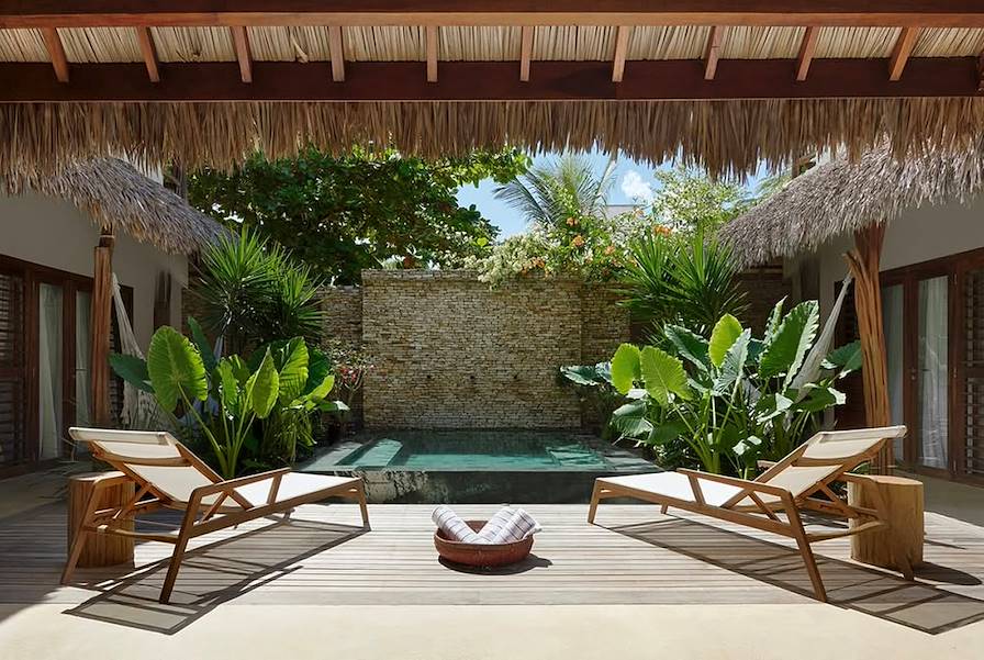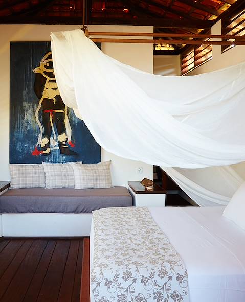 Le delta de Parnaíba disparaît dans le rétroviseur tandis que le chauffeur s'élance sur la route de Camocim, à l'embouchure du río Coreaú. Installation pour deux nuits en centre-ville, à une minute de la plage. La maison est enveloppée d'un joli jardin où poussent bananiers, sapotiers et pruniers d'Espagne. Dans le bâtiment de style colonial, la décoration intérieure crée une agréable atmosphère créole. Au restaurant, le chef fait une cuisine brésilienne d'aujourd'hui qu'influence discrètement le répertoire méditerranéen. Les tables sont dressées soit dans la salle à manger, soit sur la terrasse. Les parents peuvent se faire masser. Les enfants ? S'ils ne sont pas en train de s'éclabousser dans la piscine, vous devriez les trouver roulés dans le hamac – de loin leurs deux spots préférés.