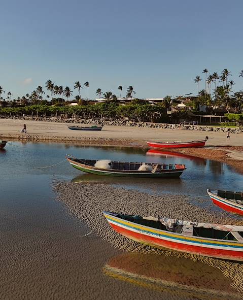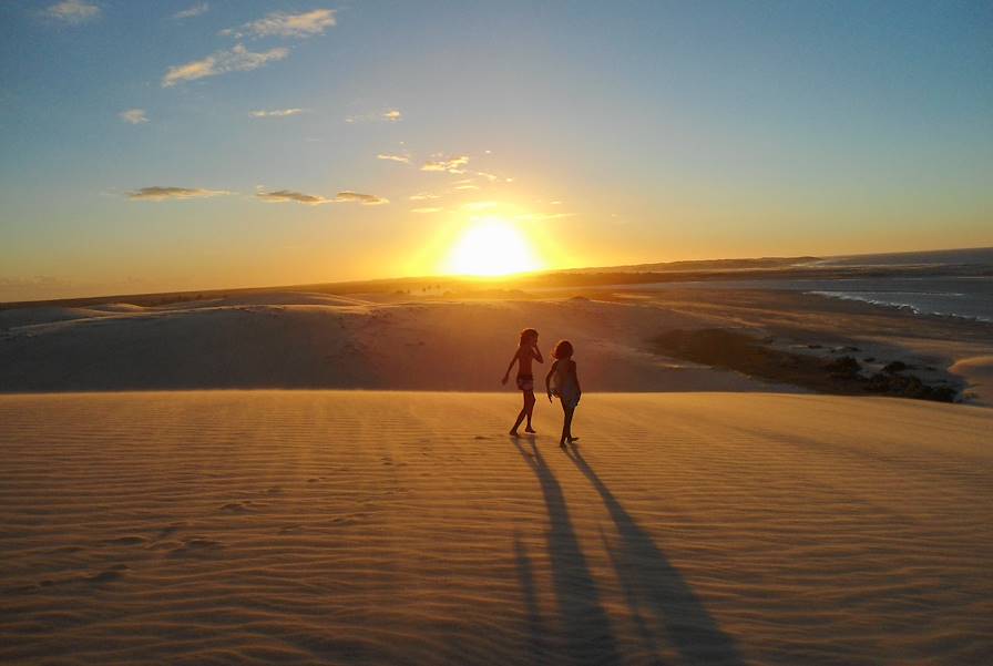 La visite d'usage des Lençóis effectuée, retour à Atins, posé aux portes du désert. Dépaysement et déconnexion sont au rendez-vous dans cet ancien village de pêcheurs posé à l’embouchure du fleuve Preguiças. Les "ruelles" de la ville sont en réalité des chemins de sables flanqués de palmiers. À quelques pas, l’océan dessine de belles lignes sur la plage. Les locaux effectuent des passages réguliers sur leurs embarcations tandis qu’une poignée d’enfants se pourchassent sur le rivage, les vôtres bientôt parmi eux.