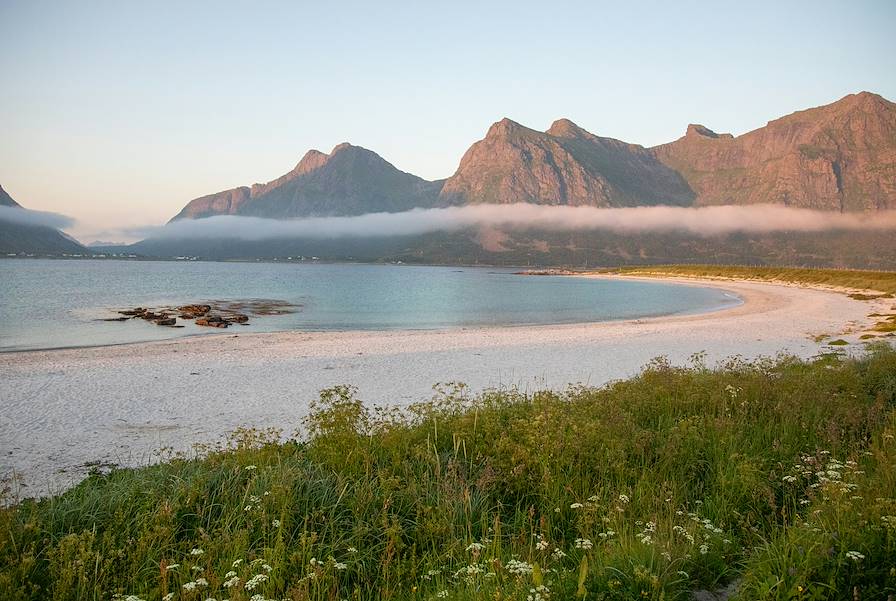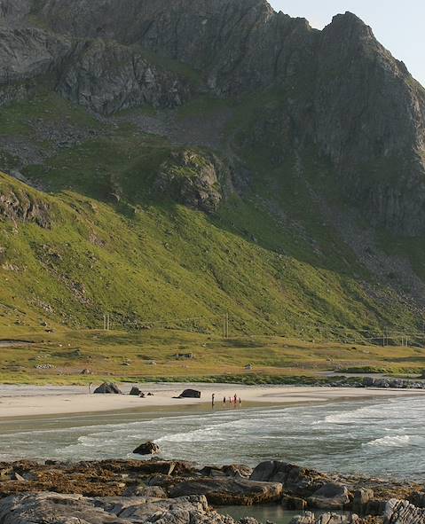 Sur la côte nord de l'île de Moskenesoya se trouve Kvalvika, l'une des plus belles plages des îles Lofoten, une étendue de sable blanc où viennent se briser les vagues, entourée de toutes parts par les montagnes. Une véritable carte postale de l'archipel. L'isolement du reste de l'île rend cet endroit presque mystique. Sur la droite de la plage se dresse le mont Ryten (540 m d'altitude), un bel objectif de randonnée. De là, on a une vue imprenable sur la plage en contrebas et les eaux tumultueuses de la mer de Norvège. Un endroit encore plus beau le soir, lorsque le soleil se pose derrière la montagne.