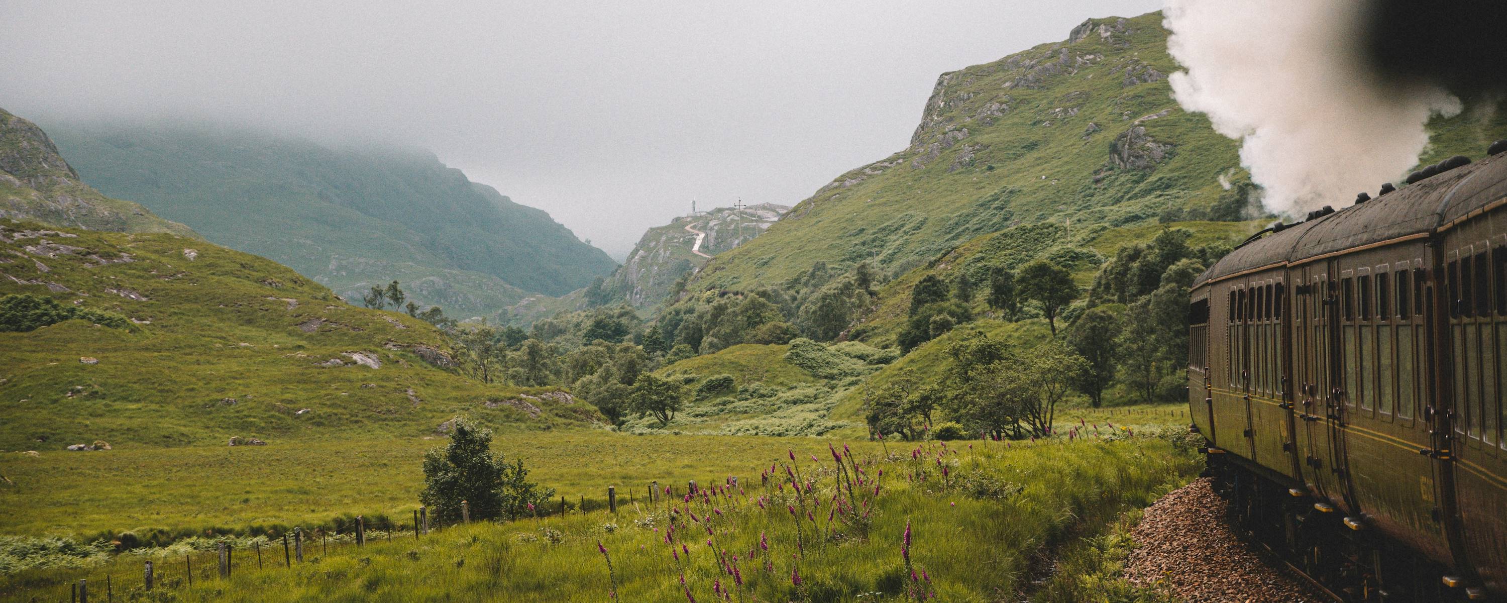 Départ en train pour la capitale écossaise. Les grandes fenêtres des cabines projettent dans le paysage à ne plus savoir si l’on est dedans ou dehors : les étendues infinies du Loch Shiel, les rives chlorophylles du Loch Eilt, le Ben Nevis et sa chevelure de brume. Puis, les landes tourbeuses et les scarifications sombres du Rannoch Moor, l'une des dernières grandes étendues sauvages d’Europe. Après avoir serpenté le long de la Clyde River, le rail s’élance sur les rives du Loch Lomond, le plus grand lac écossais. Plus de 71 km² de flots sombres et profonds, cernés de colosses majestueux cognant contre un ciel diaphane. Par la fenêtre, la nature parade à grand spectacle.