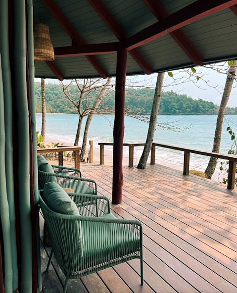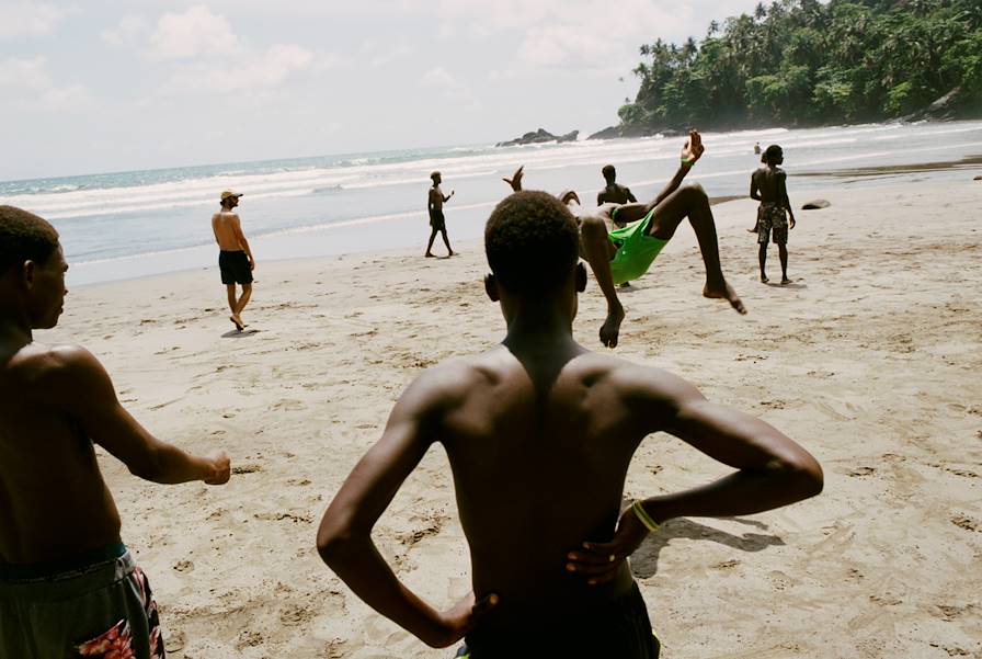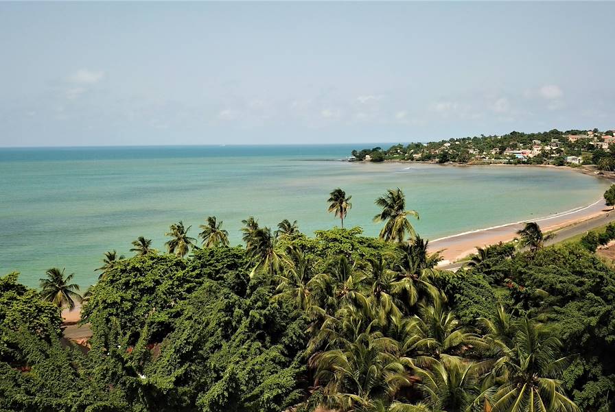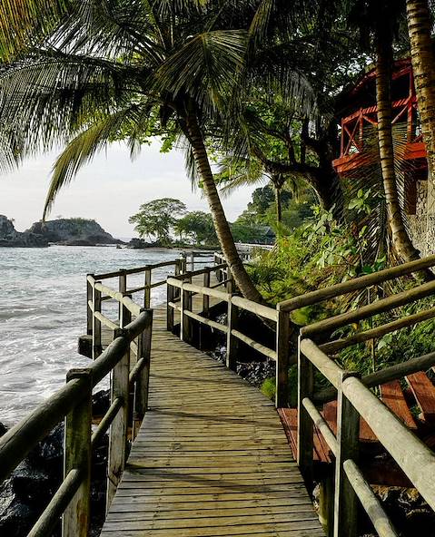 Changement de décor pour cette nouvelle journée : vous fermez les valises pour déménager dans une nouvelle adresse pour les deux prochaines nuits, toujours sur la rive nord, entre deux plages frangées de palmiers. À quelques pas s'échouent les eaux du golfe de Guinée, contraste saisissant sur les grains dorés. On y accède par un chemin privé, pour des moments de farniente toujours plus confidentiels. Parfaitement intégrés à l'environnement, les ravissants bungalows sont coiffés d'un toit de chaume. Certains sont bâtis à flanc de falaise ; gravir les quelques marches pour les atteindre est l'assurance de bénéficier d'une vue panoramique à l'arrivée. D'autres ont préféré s'établir directement sur le sable – comme on les comprend ! Les hôtes qui ne sont pas occupés à explorer la vie sous-marine se prélassent sur un transat le long de la piscine. Le soir venu, tout ce petit monde converge vers le restaurant pour un dîner aux accents exotiques.