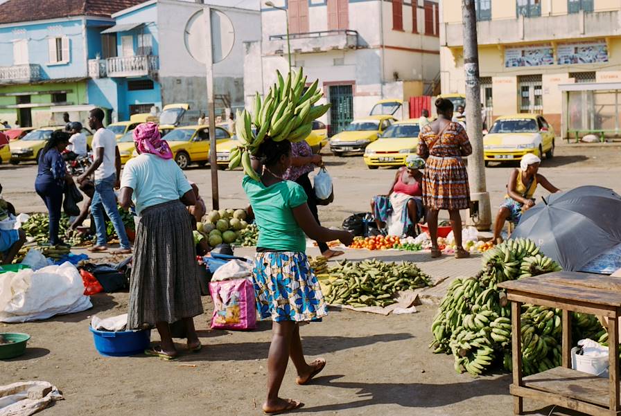 Transfert privé pour l'aéroport et vol retour vers São Tomé – cette fois pour y rester deux nuits. Vous retrouvez avec bonheur votre hôtel de l'arrivée, lové sur les rives de la baie de Praia Lagarto. La journée est consacrée à buller. Alors que la lumière décline, vous envisagez avec fébrilité, après ce beau séjour en pleine nature, l'exploration de São Tomé City, prévue le lendemain. Capitale éponyme de l’île et du pays, la ville est, de loin, la plus grande cité de l’archipel. Le long de la promenade de bord de mer jusque dans les ruelles, de grands palmiers vacillent à un rythme indolent. Au carrefour, un taxi collectif peint en jaune attend patiemment d’être plein pour s’en aller déposer ses passagers. Installés dans la benne d’un pick-up, d’autres les doublent à vive allure en s’esclaffant. L’air exhale cette énergie mêlée de décontraction typique des îles perdues au cœur de l’océan.