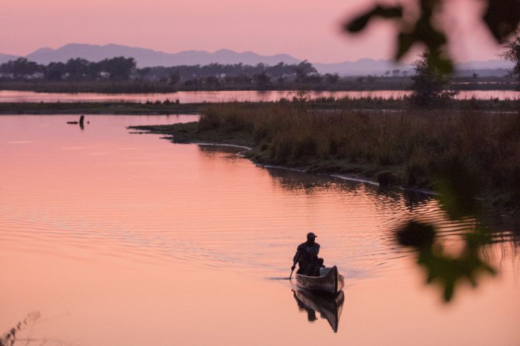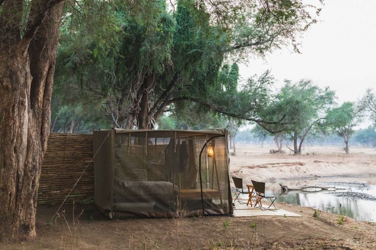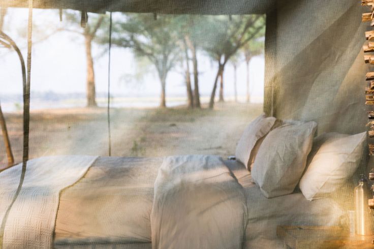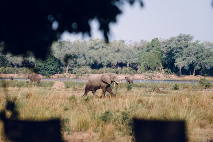Vol pour le Lower Zambezi National Park. Installation pour deux nuits au bord de l’eau, sous le couvert d’un bois d’acacias. On vit sous la tente : simple et confortable. Le matériel est léger mais d’excellente qualité. La literie notamment. On est là à touche-touche avec la nature. C’est une expérience pour tous les sens. 100% safari. La douche se prend avec un bon vieux seau de toile. Des écrans végétaux assurent l’intimité de chacun. Des zones ombragées protègent des heures les plus éblouissantes. On peut aussi se retirer dans le lounge, propice aux boissons fraîches et aux longues conversations. Les repas sont servis dans la tente mess. Ils sont d’une qualité qui étonne dans ce coin isolé. Et une table bien dressée dans le bush est toujours source d’une satisfaction intense. Le soir, on se réunit autour du feu de camp ; sensations rustiques et apaisantes entretenues par les flammes et les étincelles.